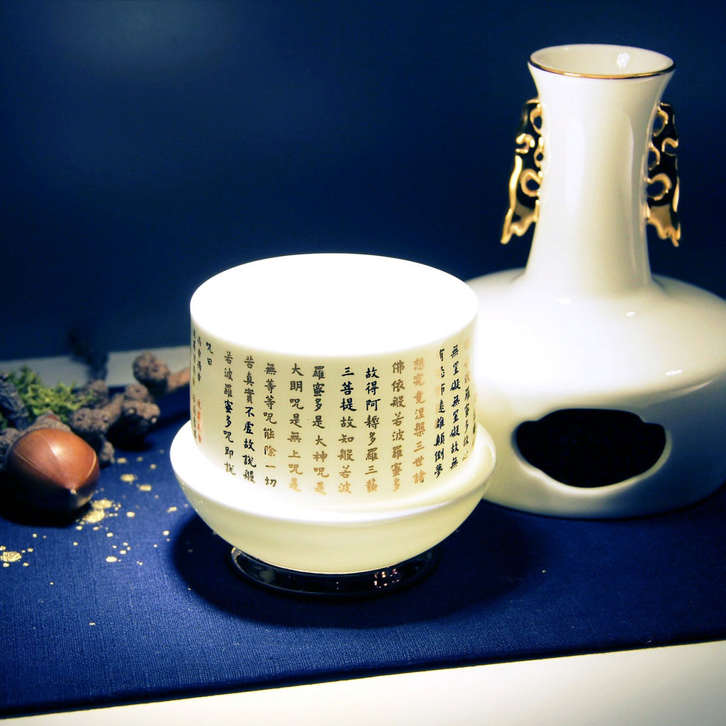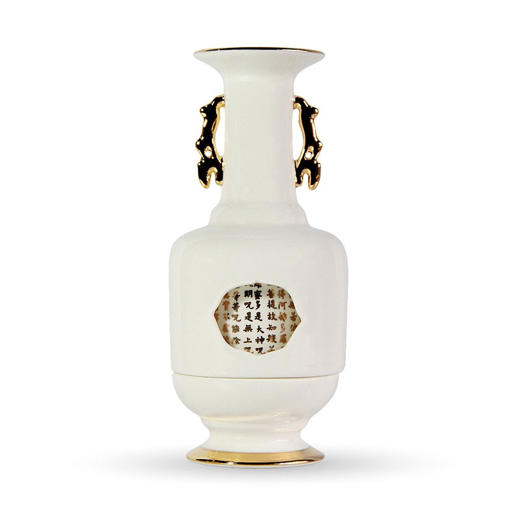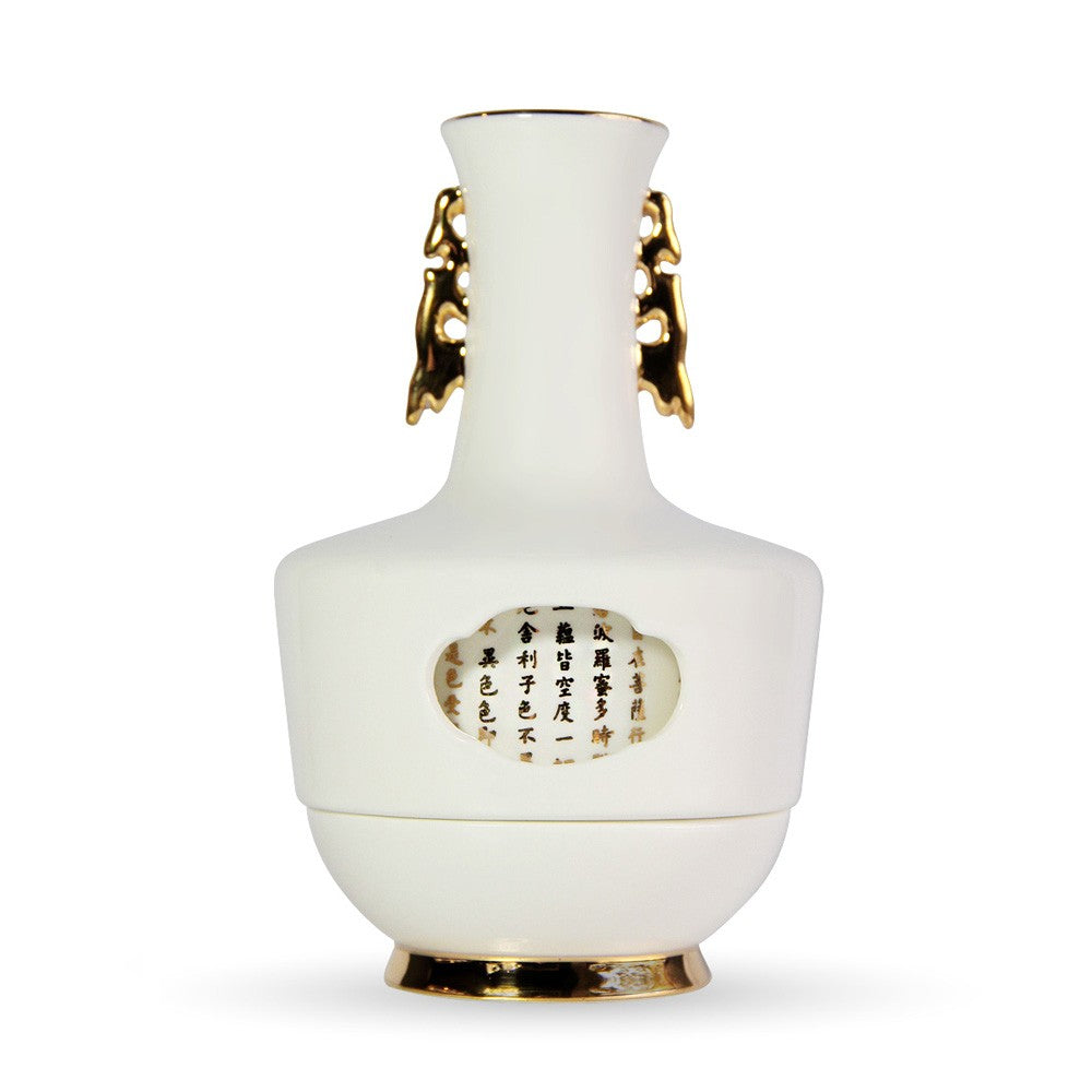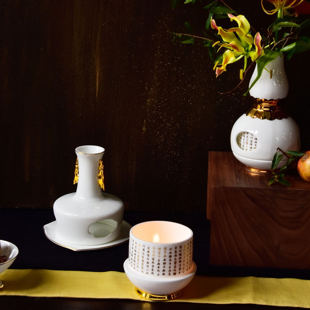 ■《心經法嚴‧寶瓶》系列設計,取材自「唐代歐陽詢般若波羅蜜多心經書帖」,寶瓶造型以故宮典藏的轉心瓶為體,骨瓷緻地薄淨透光,轉旋設計巧納雅趣,不僅是實用的居家美飾,也象徵著平安自在的吉祥寓意。 ■心經法嚴‧寶瓶-可用來插花妝點居家空間,亦或點燈供佛無比莊嚴祥和。 ■由精緻薄透骨瓷燒製,以純手工描金,細心描繪出輪廓線條。