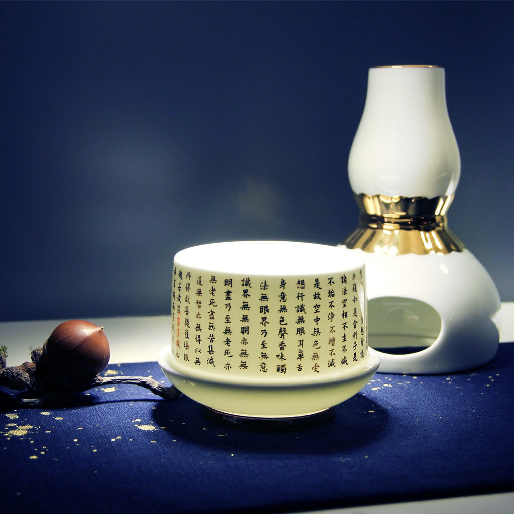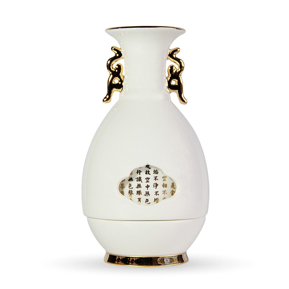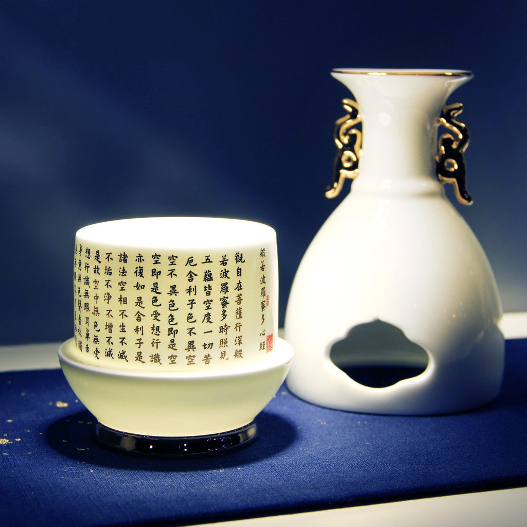 ■《心經法嚴‧寶瓶》系列設計,取材自「唐代歐陽詢般若波羅蜜多心經書帖」,寶瓶造型以故宮典藏的轉心瓶為體,骨瓷緻地薄淨透光,轉旋設計巧納雅趣,不僅是實用的居家美飾,也象徵著平安自在的吉祥寓意。 ■心經法嚴‧寶瓶-可用來插花妝點居家空間,亦或點燈供佛無比莊嚴祥和。 ■由精緻薄透骨瓷燒製,以純手工描金,細心描繪出輪廓線條。
