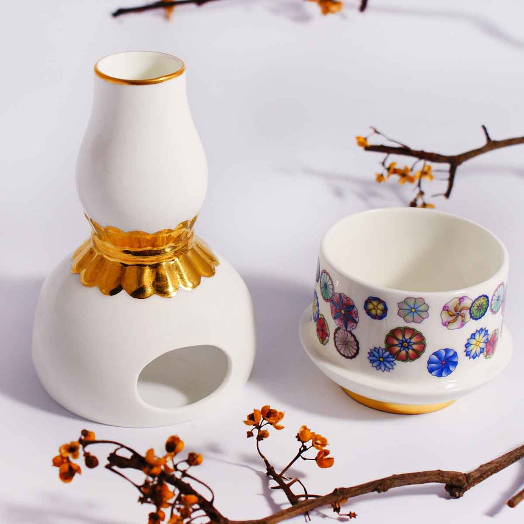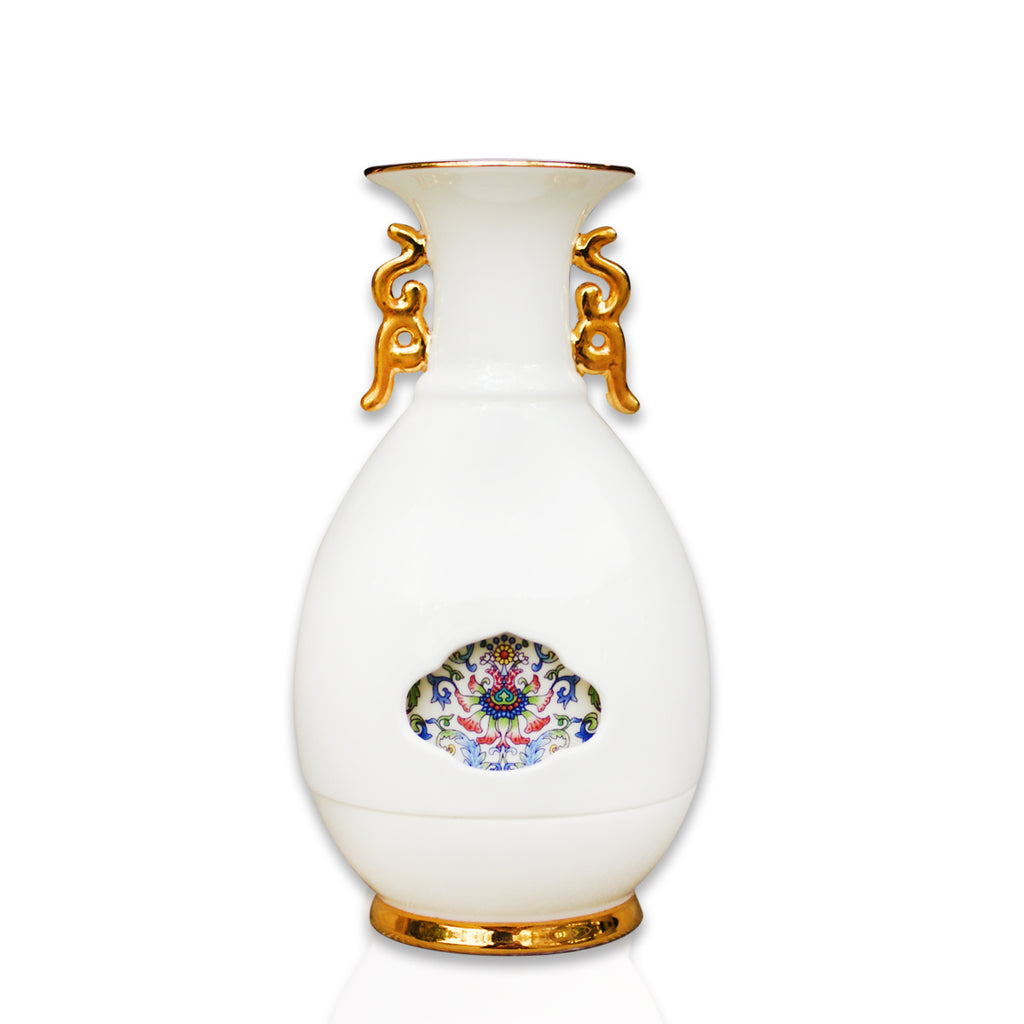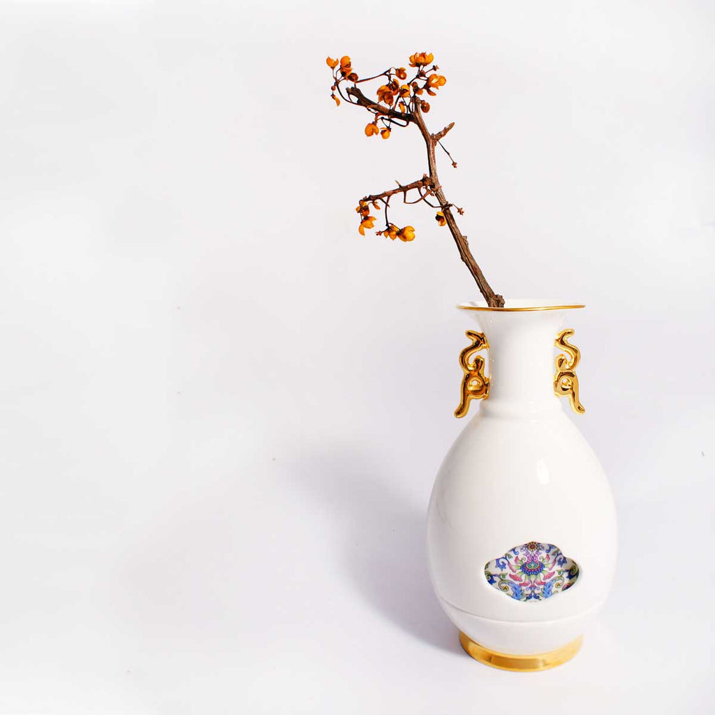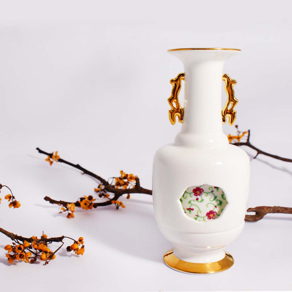此系列利用解構方式,呈現轉心瓶的效果,以「清乾隆黃地粉彩福壽活環雙耳瓶」、「清乾隆冬青描金壽字瓶」、「清乾隆磁胎洋彩轉旋葫蘆瓶」、「清乾隆洋彩黃錦地乾坤交泰轉旋瓶」瓶型做為創意來源,搭配亮麗的釉色,時尚華美。同時在瓶身開窗,飾以錦地花紋,百麗爭妍,無比尊貴,轉旋之間,別有風景。創意精緻的轉心瓶不但能做為小花器,還能當盛杯及擴香瓶,多元展現各種實用功能。 器型取自「清 乾隆 冬青描金壽字瓶」、紋飾取自「清 乾隆窯 琺瑯彩藍地花卉小碗 」。 注意事項 1.本產品不得放入洗碗機、微波爐、烤箱使用。 2.請用中性洗滌劑和海綿清洗。 3.產品一旦使用後經嚴重碰撞或產生裂痕,不建議繼續使用。 4.因拍攝略有色差,圖片僅供參考,顏色請以實際收到商品為準。
