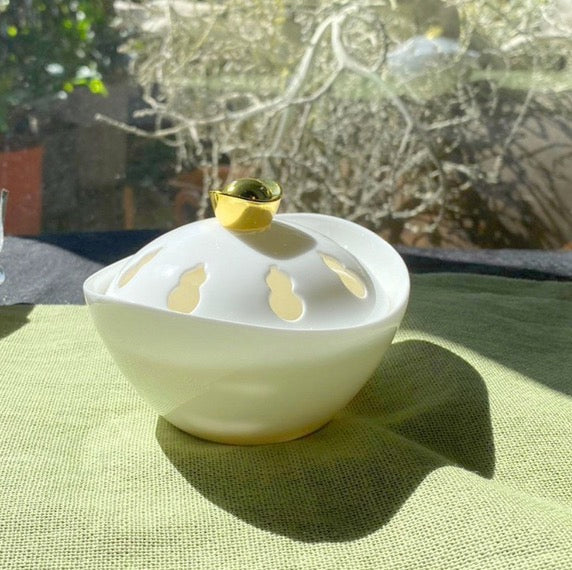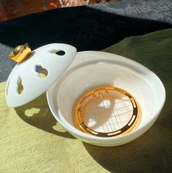 材質:42%骨瓷、24K手工描金 內容物:元寶香爐*1、香盤*1 尺寸:10.8x9x7.5cm 包裝:精緻紙盒33.5x13x11cm