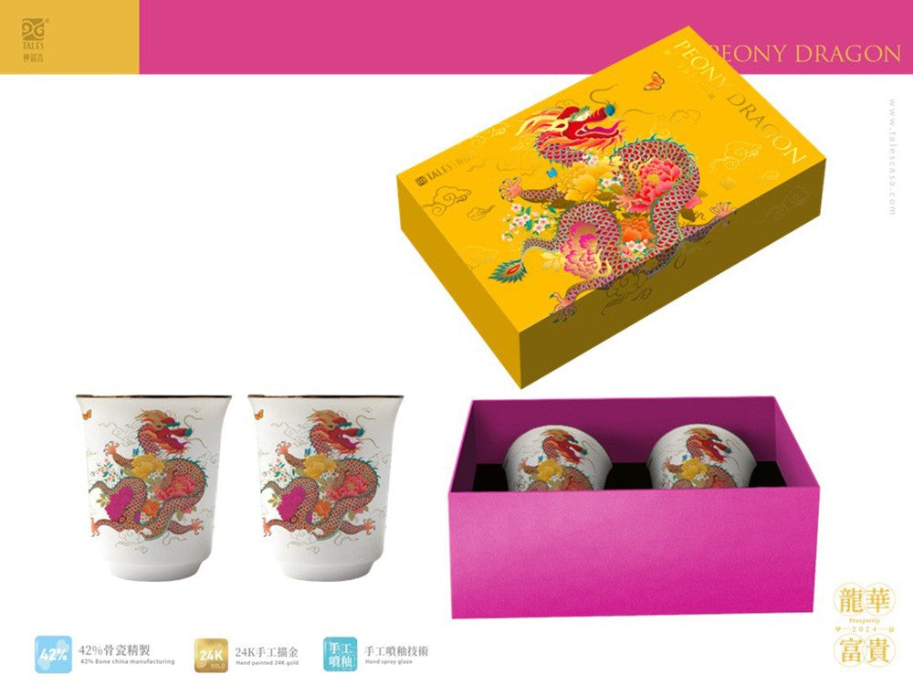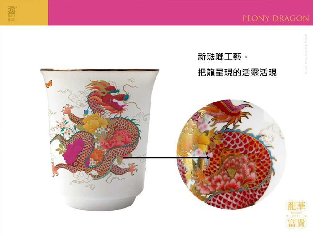 ■龍是傳統文化的吉祥神獸,代表著尊貴、力量和喜瑞;牡丹是花中之王,富貴華麗的代表。 ■結合祥雲、蝴福蝶,運用皇家金黃色系及六宮粉黛的時尚粉彩,傳達「龍華富貴」的豐茂吉年寓意,同時流露當代美學的創新對話! ■甲辰龍年,祝福大家今年步步高升「飛龍在天」,天天平安「龍行大運」,日日坐享「龍華富貴」! ■新琺瑯工藝,把龍呈現的活靈活現,精緻薄透骨瓷燒製,造型典雅細緻。