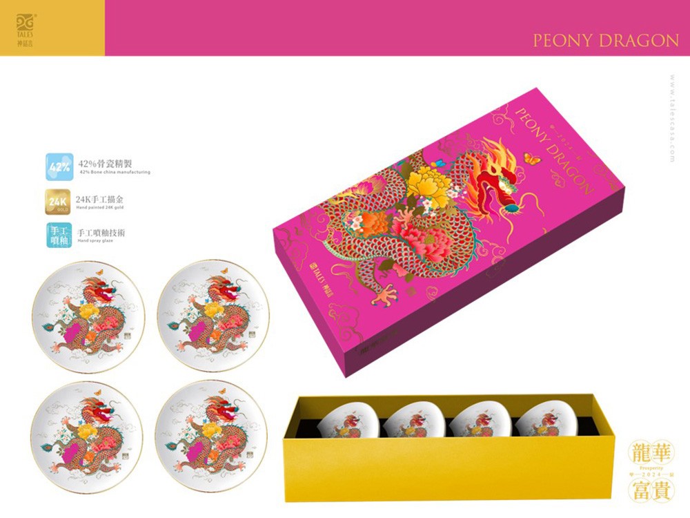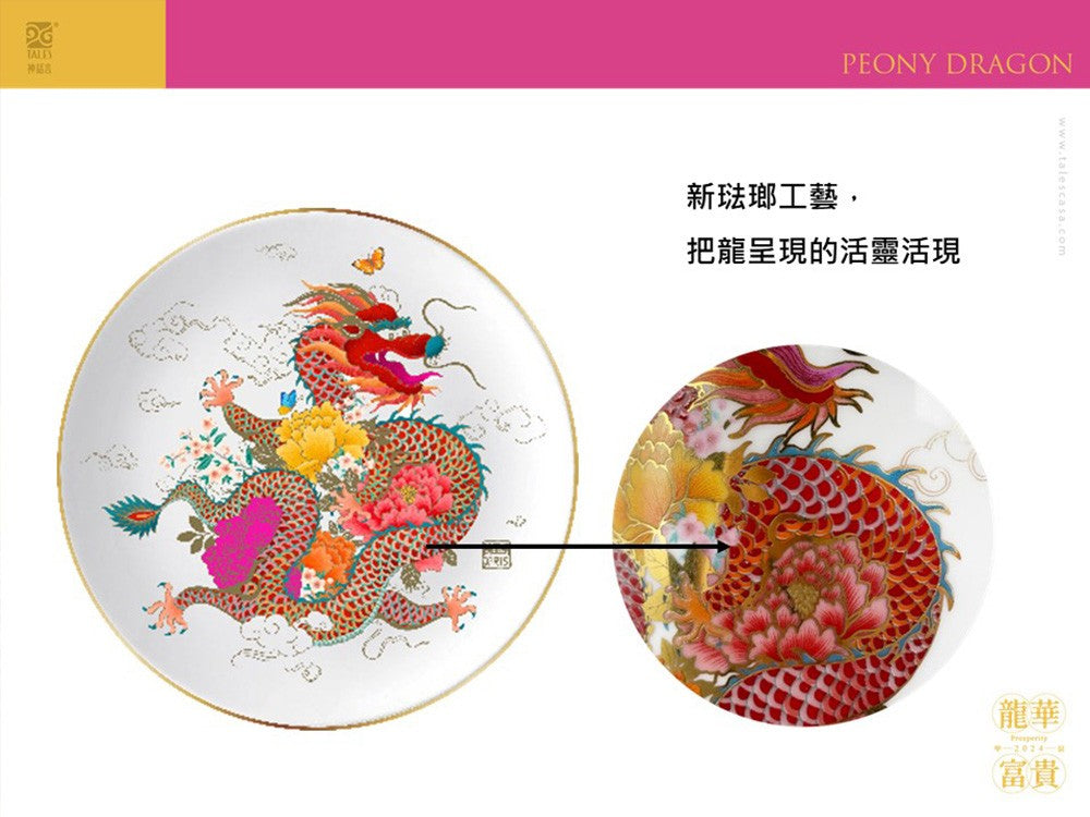 ■龍是傳統文化的吉祥神獸,代表著尊貴、力量和喜瑞;牡丹是花中之王,富貴華麗的代表。 ■結合祥雲、蝴福蝶,運用皇家金黃色系及六宮粉黛的時尚粉彩,傳達「龍華富貴」的豐茂吉年寓意,同時流露當代美學的創新對話! ■甲辰龍年,祝福大家今年步步高升「飛龍在天」,天天平安「龍行大運」,日日坐享「龍華富貴」! ■新琺瑯工藝,把龍呈現的活靈活現,精緻薄透骨瓷燒製,造型典雅細緻。