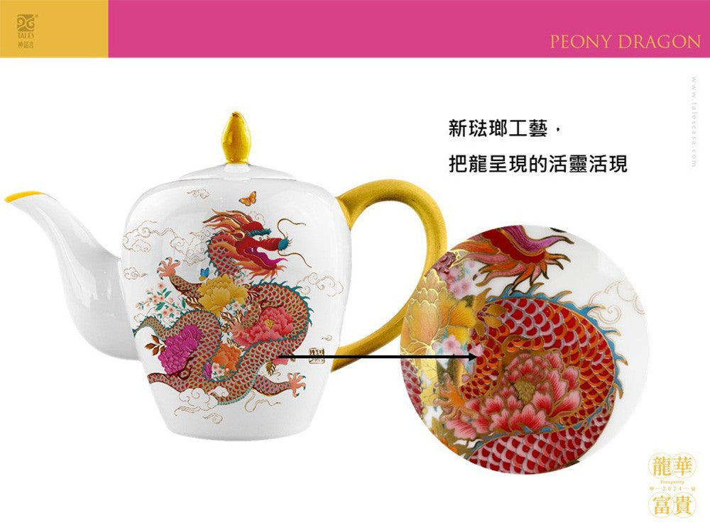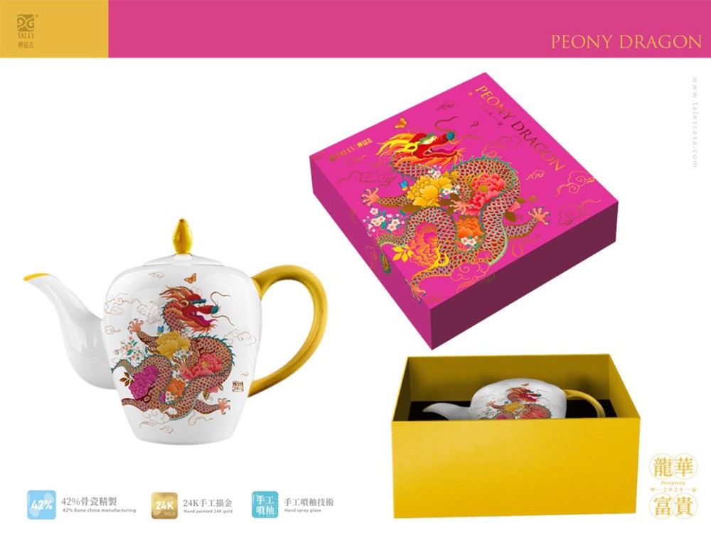 ■龍是傳統文化的吉祥神獸,代表著尊貴、力量和喜瑞;牡丹是花中之王,富貴華麗的代表。 ■結合祥雲、蝴福蝶,運用皇家金黃色系及六宮粉黛的時尚粉彩,傳達「龍華富貴」的豐茂吉年寓意,同時流露當代美學的創新對話! ■甲辰龍年,祝福大家今年步步高升「飛龍在天」,天天平安「龍行大運」,日日坐享「龍華富貴」! ■新琺瑯工藝,把龍呈現的活靈活現,精緻薄透骨瓷燒製,造型典雅細緻。