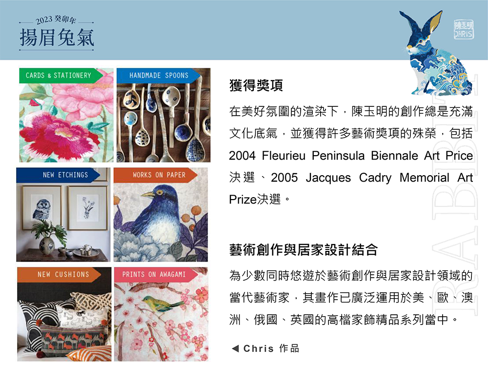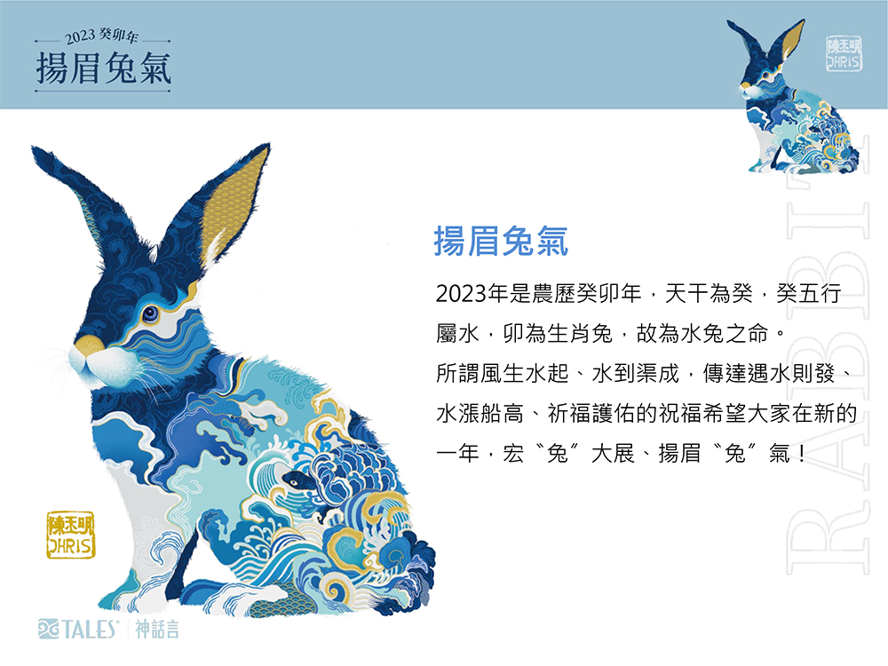 ■2023年是農歷癸卯年,天干為癸,癸五行屬水,卯為生肖兔,故為水兔之命。 ■所謂風生水起、水到渠成,本作品特別加入祥雲及浪紋的喜兆寓意,同時巧妙融入代表尊貴、長壽的騰龍、壽龜等庇護吉獸。 ■不僅呈現傳統與當代的國際美學對話,同時傳達遇水則發、水漲船高、祈福護佑的祝福,希望大家在新的一年,宏〝兔〞大展、揚眉〝兔〞氣!